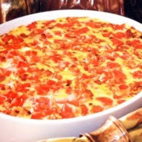 Pour over turkey. Sprinkle evenly with bacon and tomato. Bake for 20 to 25 minutes, or until hot and bubbly.