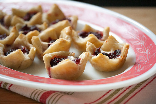 3. Nestle a cube of brie into each pastry cup, then top with a pinch of green onion. Using a teaspoon measure, drop a spoonful of cranberry sauce to top of the brie.