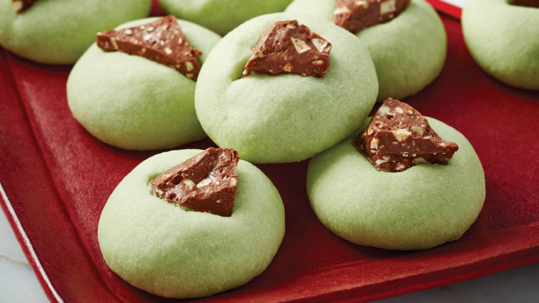 In another bowl, use a wooden spoon to cream together the butter and sugar. Mix in mint extract and food colouring. Gradually stir in the flour mixture to make a soft dough. Using rounded tablespoons of dough, roll each spoonful into a ball (aim for walnut-sized). Place on lined baking sheets about 2 in. (5 cm) apart. Make 30 balls.