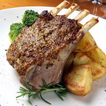 Coat fat side of each rack with Dijon mustard and breadcrumbs.