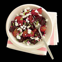 Add the beets to a large pot of boiling water; simmer until tender, about 40 minutes. Let cool. Peel and cut into 1/2-inch cubes. Add the tangerine segments, onion, mint and 2 tablespoons olive oil; toss. Top with goat cheese.