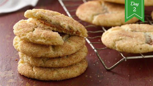 Shape dough into 1 1/4-inch balls. Press thumb into center of each cookie to make deep indentation, but do not press all the way to cookie sheet. Place 1 dollop of the dulce de leche into center of each cookie, making sure to form dough around dollop to enclose. If necessary, work with lightly floured fingers so dough doesn’t stick. You may have to return dulce de leche dollops to freezer if they become too warm to work with.