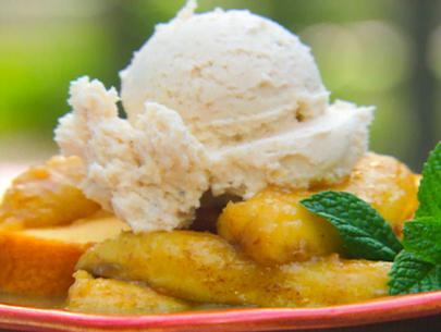 Melt butter in a large skillet. Add brown sugar and stir together. Add the bananas and cool until caramelized over medium-high heat. Pour in the rum and catch a flame off the gas stove or BBQ lighter. Stand back when ignited and flambé. Be careful; a flame will shoot above the pan. Let flame die down. Serve over ice cream and/or a slice of pound cake.