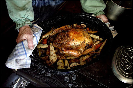 To serve, carve chicken as desired and serve each portion with some of vegetables and apples.
