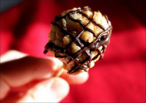 Bring karo and sugar to a boil and add peanut butter and rice krispies. Spread in 9x13 pan. Sprinkle on chocolate chips and place under broiler for a minute. Spread chips
