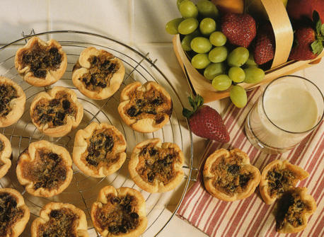 Roll out pastry and cut into twelve 5-inch (13 cm) circles. Set each circle loosely into 3-inch (7 1/2 cm) muffin cup. Sprinkle raisins over bottom of each tart shell, if desired, and chill.