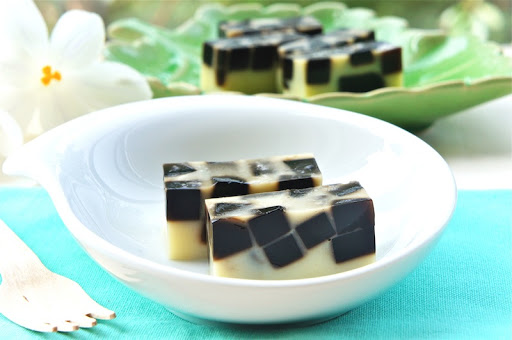 Take the pan off the heat immediately, and discard the Pandan leaves. Strain the contents into a baking dish. Set aside to cool for about 5 minutes, and scattered the grass jelly into the soybean mixture. When cool, chill the jelly in the refrigerator. Cut as desired and serve chilled.