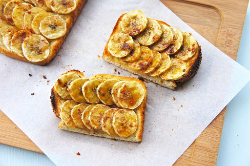 Lightly spread butter on bread, layer with sliced bananas, and sprinkle with cinnamon and some brown sugar. Then, bake in the oven for 10 minutes and broil them for another 2 minutes. Serve warm with some confectioners sugar, maple syrup, or honey, if desired.