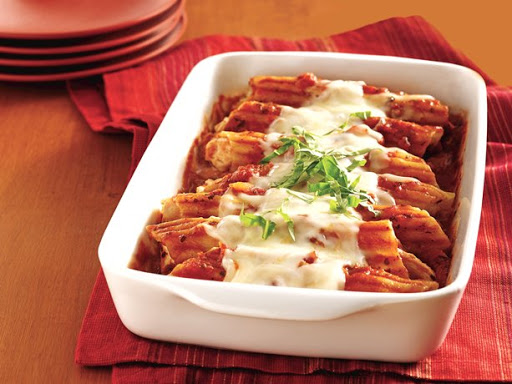 Heat oven to 350°F. In medium bowl, mix pasta sauce and water. Spread about 1/3 of the pasta sauce mixture in ungreased 13x9-inch (3-quart) glass baking dish.