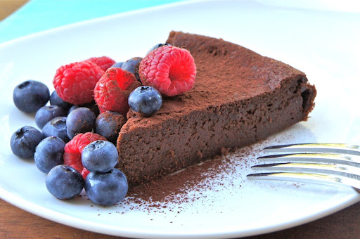 To serve, slide a slim knife around the inside of the pan to loosen the cake. Remove the pan sides and transfer the cake, on the pan bottom, to a platter, or invert the cake onto a rack or tray, remove the bottom and the paper liner, and invert again onto a platter. Using a fine-mesh sieve, sift a little powdered sugar or chocolate over the top of the cake before serving, if desired. Serve each slice with some mixed berries or whipped cream, if desired.