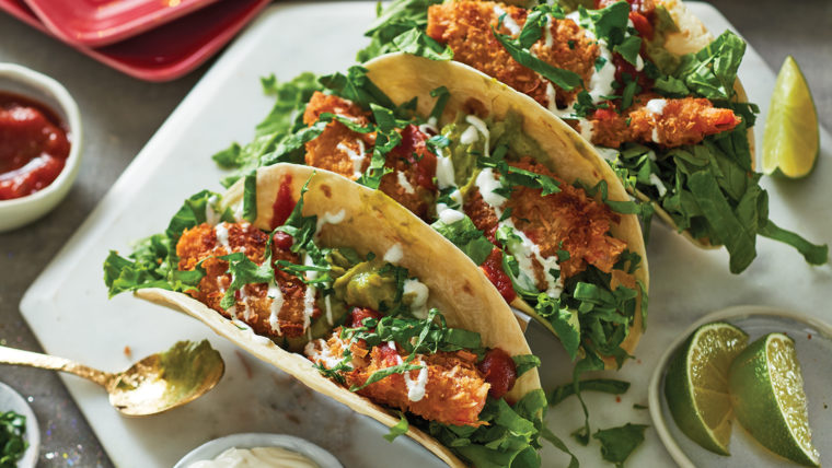 Spread a dollop of avocado mixture onto each tortilla; top with coconut shrimp, lettuce, salsa and sour cream.