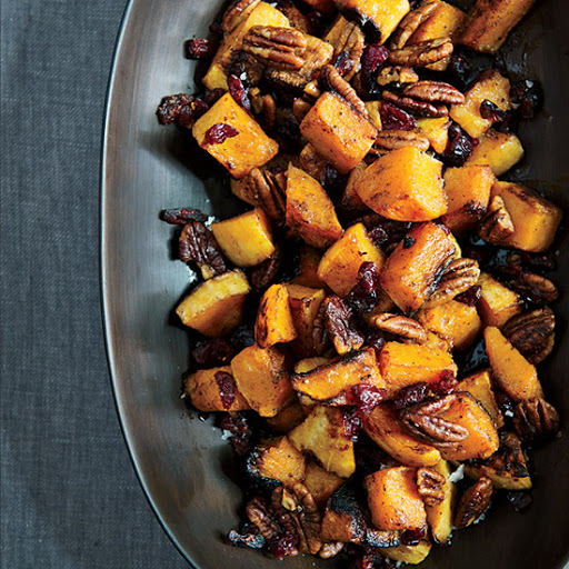 Arrange the squash on a platter and drizzle the dressing on top. Scatter the cranberries and spiced nuts over the squash and serve warm.