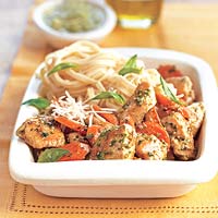 3. Drain pasta. Return to pan; toss with remaining butter. Serve with chicken mixture. Sprinkle pasta with Parmesan cheese and ground black pepper. Drizzle with olive oil and top with basil. Makes 4 servings.