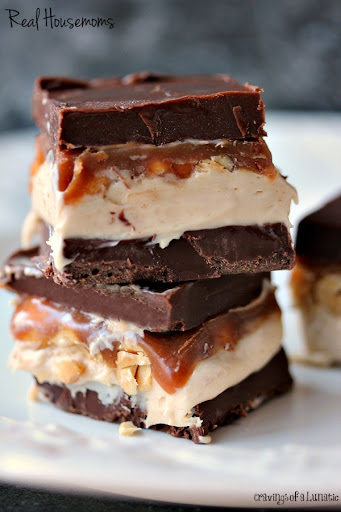 Use a double boiler to melt the caramels in the cream. Simmer over hot water until caramel is smooth. Allow to cool slightly. Now pour the cooled caramel over the filling mixture and peanuts. Pop back in the freezer for about 5 to 10 minutes.