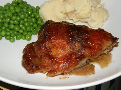 I have to say that while this is nothing out of the ordinary, it was a very good variation on roast chicken with barbecue sauce. The sauce had the perfect blend of flavors, it adhered to the chicken perfectly and it didn't burn (that can be a problem with sweet sauces).