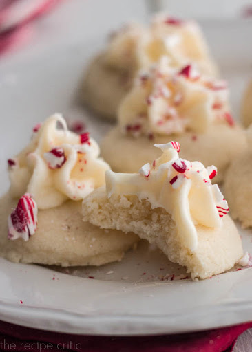 To make the peppermint cream cheese frosting, cream together cream cheese and butter. Add peppermint extract and slowly add the sifted powdered sugar. Frost the cookies with the frosting and garnish with crushed peppermint candy canes.