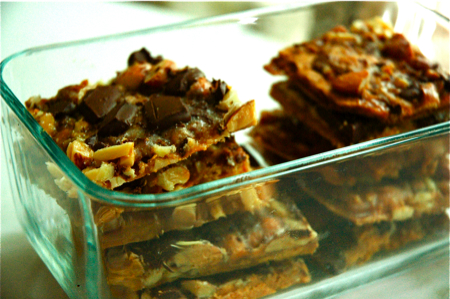 Preheat oven to 350 degrees F. Line a rimmed baking sheet with foil. Place graham crackers in a single layer on sheet, edges touching. Sprinkle toffee bits and almonds over graham crackers. Sprinkle toffee bits and almonds over graham crackers.