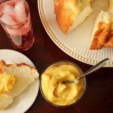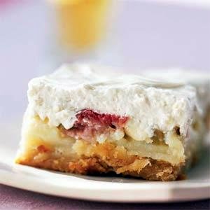 A delicious sweet bar with a tender shortbread crust topped with a rhubarb-studded custard and a fluffy cream cheese topping. A great dessert to end a perfect meal.