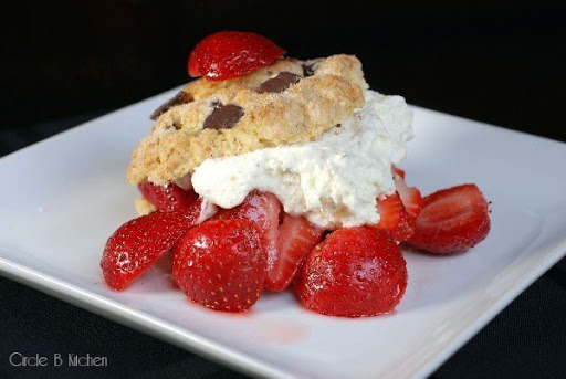 To make the shortcakes: Sift together the dry ingredients into a bowl. Add the butter and mix with your fingers until it is broken up and the mixture has the texture of wet sand. Add the buttermilk and gently mix it in. Stir in the chocolate chips. Shape the dough into 6 or 7 shortcakes on the baking sheet. Space them about 4 inches apart on the baking sheet. Place the baking sheet on another baking sheet. (This keeps the bottom of the shortcakes from burning.) Sprinkle the tops of the shortcakes with sugar.