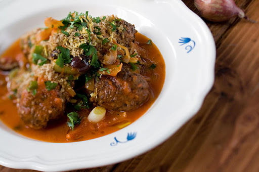 Form football shaped meatballs, dredge with flour, and pan-fry in until brown on all sides, then transfer to a paper towel. Once all meatballs have been browned, add them to the pot with the tomato sauce and braise for an hour. Season. With salt and pepper.
