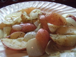 1 Pre-heat oven to 400 degrees. 2 Slice red potatoes so they are about an 1/2 inch thick.*. 3 Chop onions into large peices. 4 Put the olive oil into a bowl. 5 Put all of the onions and potatoes into the bowl with olive oil. 6 Stir the veggies (preferably with a slotted spoon) until they are all equally coated with olive oil. 7 Take the cookie sheet and place some tin foil on the sheet. 8 Make a cross with two sheets of tin foil on the foil covered cookie sheet (make sure you have enough foil to create a pouch for your potatoes and onions). 9 **I think Reynolds sells pre made aluminum foil pouches -- I didn't have them handy but my homemade pouch worked fine.**. 10 Transfer the onions and potatoes to the center of the tin foil cross, making sure to drain the excess olive oil (why the slotted spoon comes in handy!). 11 When you have all the veggies in the middle sprinkle your seasoning mixture on the potatoes, putting as much on as you like. 12 After seasoning, take all four sides of the tin foil cross and bring them up and into the center, making a little pouch for the potatoes and onions to cook inches. 13 Place in a 400 degree oven for 30 minutes. 14 Potatoes will be done when you can stick a fork through a potato without resistance. 15 *Adjust cooking time to fit the size of the potatoes you want.