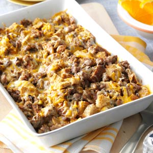 pink; drain. Place bread cubes in a greased 13-in. x 9-in. baking