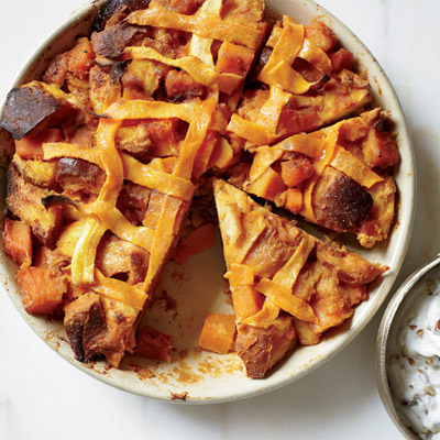 These creamy pumpkin bread puddings are baked in pie dishes so they're like a hybrid dessert; the lattice top is actually made of strips of butternut squash.