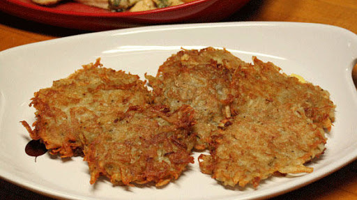 Set up a bowl of cold salted water. Peel the potatoes and as you peel them, put them in the bowl of salted water. Drain the potatoes, grate them and place them in a sieve set over another bowl. Let them drain over the bowl, collecting all of that liquid for a good 20-30 minutes. Press on the potatoes to get out more liquid.