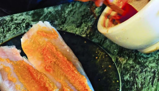 Miso tends to burn when broiling, so be very careful that the fish is not close to the heat source. Also do not forget to oil the grill with a mild oil such as rapeseed. The miso dries out on the skin, giving the fish a slight crust and a moist center.