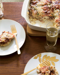 Bake the strata in the center of the oven for 30 to 35 minutes, until bubbling and browned around the edges. Remove the parchment and turn on the broiler. Broil for about 3 minutes, just until the top is golden and bubbling. Let rest for 10 minutes, then cut the strata into squares and serve.