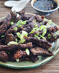 - 3 pounds flanken-cut beef short ribs (1/3 inch thick), torn into 2-inch lengths