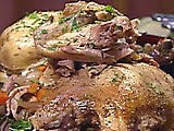 Remove the chicken from the slow cooker, and pour the accumulated juices into a 2-cup heatproof container. Skim the fat from the top and transfer the liquid to a small saucepan. Dissolve the cornstarch in a small bowl with 2 teaspoons of water and whisk to form a slurry. Whisk the slurry into the juices and bring to a boil over high heat. Cook until thickened, season with salt and pepper, and continue to cook an additional 4 to 5 minutes. Cut the chicken into pieces and serve, with the thickened pan juices ladled over the top.