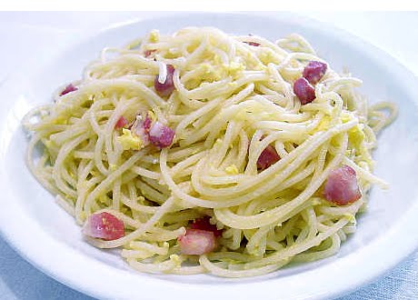 Place bacon in frying pan and cook until crisp. Set aside. In another frying pan place butter, garlic and onion fry until opaque. Add whipping cream and cook until thickened slightly. Beat egg and cheese in abowl along with black pepper.