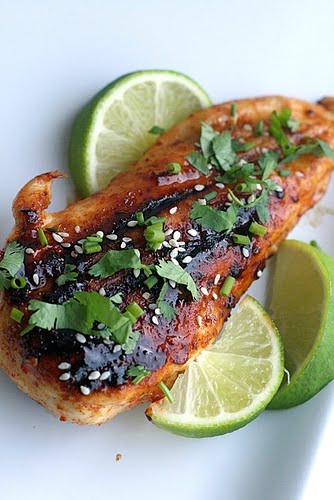 Place the chicken on the heated grill and cook for 3-4 minutes. Flip the chicken and brush the cooked side of the chicken pieces with the honey-chipotle glaze. Cook for an additional 3-4 minutes; flip the chicken again and brush the second side with the glaze. Cook for 1 minute, flip again and cook for 1 minute more. Remove from the grill and brush with more sauce as desired. Garnish with sesame seeds, cilantro and chives as desired; serve.