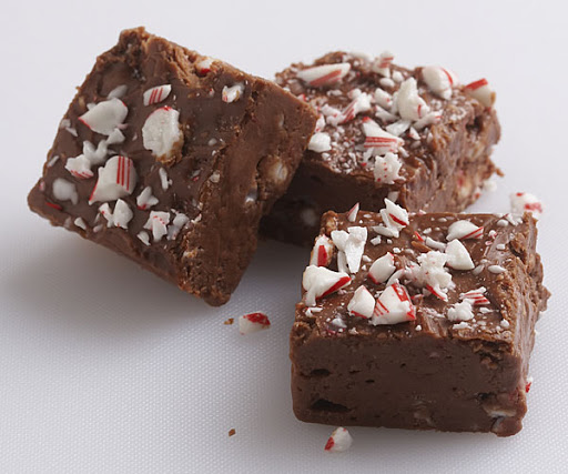 Remove the thermometer from the fudge mixture. Using a hand mixer, beat the mixture on high speed until it is a few shades lighter in color and thickens enough that the beaters form trails that briefly expose the bottom of the pan as they pass through, 10 to 20 minutes. After beating the fudge, stir in 1/2 cup crushed peppermint candy. Pour the thickened fudge into the prepared pan, using a rubber spatula to help nudge it out of the pot. You can scrape the bottom of the pot but not the sides; any crystals that stick to the pot stay in the pot. Smooth the top of the fudge with the spatula. Sprinkle 1/4 cup crushed candy over the fudge. Set the pan on a rack and let the fudge cool completely, about 2 hours. The fudge will be slightly soft the day it’s made but will firm up overnight.