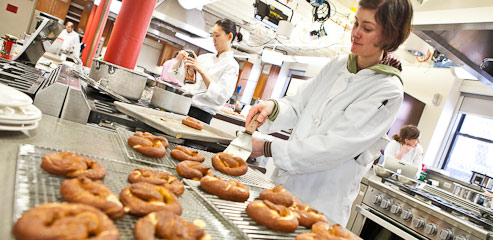 We use kosher salt on the exterior of our pretzels, but coarse pretzel salt may be substituted. However, be sure to still use kosher salt in the dough. Keep in mind that the dough needs to rise for 60 minutes, and then the shaped pretzels require a 20-minute rise before boiling and baking. These pretzels are best served warm, with mustard.