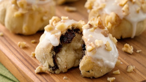 Spoon rounded teaspoonful hazelnut spread onto center of each rectangle. Brush edges of rectangles with melted butter. Bring dough up around filling to cover completely. Pinch edges together to seal; shape into ball. Place seam side down, 2 inches apart, on ungreased cookie sheet.