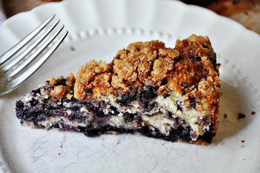 For the cake, whisk together the flour, salt & baking powder in a mixing bowl. Add the sugar & butter to the bowl of an electric mixer fitted with a paddle attachment. Beat until the mixture is light & fluffy {about 1 minute}. Add the egg & vanilla, beat until smooth. Pour in half of the flour mixture, then the milk, followed by the remaining dry ingredients. Beat after each addition. Remove the bowl from the mixer & gently fold in the blueberries.
