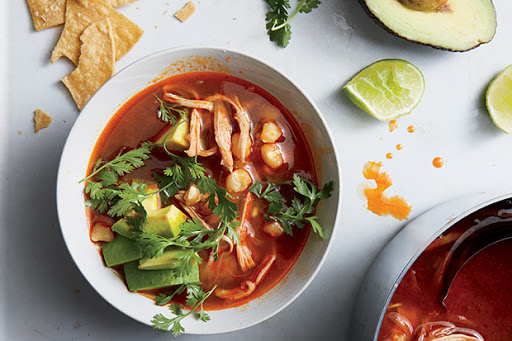 Heat 2 tablespoons olive oil in a large pot over medium heat. Cook 1 thinly sliced medium onion, stirring occasionally, until translucent, 6–8 minutes. Add 2 tablespoons chile paste and cook, stirring, until thick and darkened, about 4 minutes. Add two 15-ounce cans white hominy, rinsed, 8 cups turkey stock or low-sodium chicken broth, and 2 cups shredded cooked turkey meat; season with salt and pepper. Simmer until flavors meld, 10–15 minutes.
