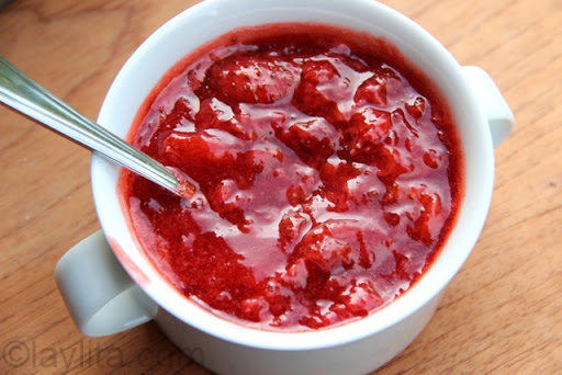 This strawberry sauce is a great sauce for topping pancakes, crepes, french toast, waffles, ice cream, cakes and more. One of great things of making your own fruit sauces at home is that you can control how much sugar is added – which can also be adjusted based on the sweetness of the fruit. You can make this sauce any time of the year, during the winter you can use frozen strawberries in place of fresh ones, and during the spring/summer months it’s a delicious way to use those fresh strawberries. Homemade fruit sauces are also a good way to get kids involved in the kitchen, the younger ones can help wash the strawberry while the older ones can help cut the fruit and stir it. My kids love making topping sauces that they can then use on their favorite breakfast or dessert. -Laylita