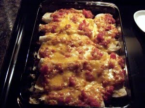 2) Meanwhile, cook beef; drain fat and stir in beans. Warm the tortillas in the oven to make them easier to roll; remove. Spread 1/2 cup sauce into a rectangular baking dish. Divide the beef mixture and 3/4 cup of cheese among tortillas. Fold over tortilla sides. Place seam side down in the baking dish. Pour the remaining sauce on top and bake, uncovered, about 15 minutes. Sprinkle on remaining cheese and bake another 5 minutes more or until cheese is melted. Make 8 servings.