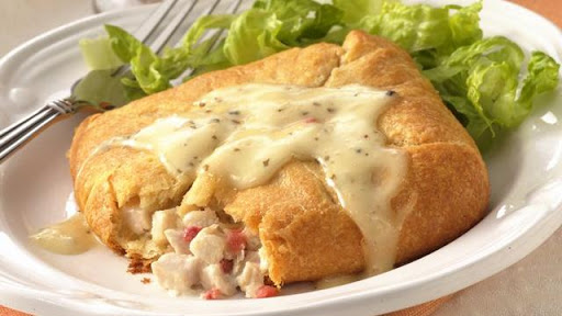 Spoon about 1/2 cup chicken mixture onto center of each dough rectangle. With knife, cut each corner of each rectangle from edge to within 1/2 inch of filling. Bring the 8 points of each rectangle up over filling; firmly pinch to seal, forming a square.