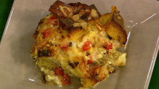 In a medium bowl, whisk together the eggs, milk, cream, chives and some salt and pepper. Pour the mixture evenly over the bread and give a little stir to make sure it's evenly distributed. Sprinkle with the reserved cheese. Cover with plastic wrap and let soak for 30 minutes.