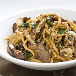 Ordinary takeout pork lo mein invariably disappoints, with greasy flavors and sodden vegetables. We wanted a dish representative of the best that a good Chinese home cook could turn out: chewy noodles tossed in a salty-sweet sauce and accented with bits of smoky, barbecued pork and still-crisp cabbage. First we needed to tackle the char siu, preferably perfecting a stir-fried version since we were already stir-frying the vegetables. Country-style pork ribs won for best cut. Though fatty, these meaty ribs have the same rich flavor of pork shoulder—but don’t need to be cooked for hours since they’re naturally tender. To avoid an overly greasy dish, we trimmed the fat and cut the meat into thin strips that would allow our classic Chinese marinade to penetrate effectively. A few drops of liquid smoke mimicked char siu’s characteristic smoky flavor. Turning to the noodles, only ones labeled “lo mein” at the Asian market won raves. Fortunately, dried linguine, cooked to al dente, worked beautifully. For the vegetables, we opted for traditional choices—cabbage, scallions, and shiitake mushrooms—stir-frying them with garlic and fresh ginger. We used our meat marinade as a sauce base, with a little chicken broth and a teaspoon of cornstarch added for body. A splash of Asian chili-garlic sauce added a little kick.