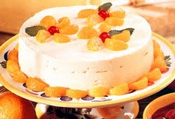 Just before serving, run a knife around edge of pan to loosen. Remove sides of pan. Garnish with oranges and cherries. Yield: 10-12 servings.
