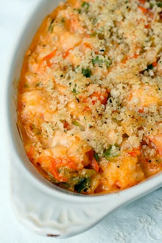 Add the cream sauce and cooked vegetables to the bowl with the seafood and toss to blend well. Divide the mixture between individual gratin dishes. If not baking right away, cover with plastic wrap and refrigerate.