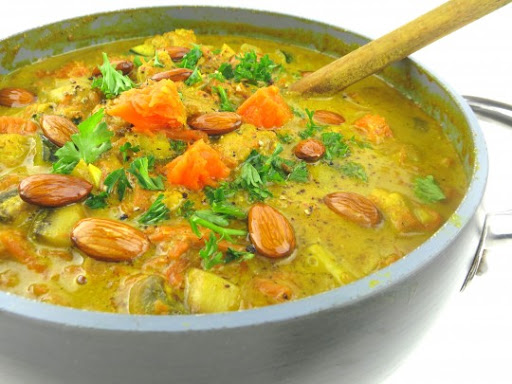 This is a rich and satisfying stew with an exotic twist. It is inspired by Asian peanut-curry, but instead of peanuts it uses almond butter and toasted almonds as a garnish – Yummy! (Peanuts are high in mold, and as legumes they’re not on the Paleo diet.) I served it in bowls without rice or noodles, so it is a high nutrient meal that’s also lower in carbs. This is a very flexible recipe that you can change as you like. It is also delicious with chicken or your choice of meat. Serves 6.