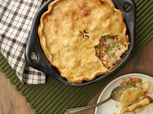 Return the chicken to the pan. Unfold the pie crust and place over the top of the filling, tucking the excess edges inside the pan. Brush the crust evenly with the egg wash. Using a knife, gently cut 3 vents in the top of the crust. Place in the oven and bake until the crust is golden brown, about 20 minutes.