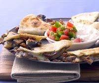 2. In another large skillet or on a griddle melt 1 piece of the butter over medium heat. For quesadilla, sprinkle 1/4 cup cheese over half of each tortilla. Top cheese with 1/3 cup of the mushroom mixture. Fold tortillas, in half, pressing gently. In prepared skillet cook one quesadilla for 2 to 3 minutes or until lightly browned, turning once. Remove quesadilla from skillet; place on baking sheet. Keep warm in a 300 degree F. oven. Repeat with remaining butter and quesadillas. Spoon sour cream into a bowl; sprinkle with tomato, sweet pepper, and green onion. Cut quesadillas into wedges; serve with sour cream sauce. Makes 4 appetizer servings.