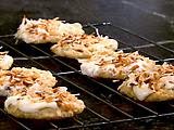 When the cookies are cool, dip them halfway into the melted white chocolate and then into the toasted shredded coconut flakes. Set them down onto parchment paper-lined sheet pans to dry completely.